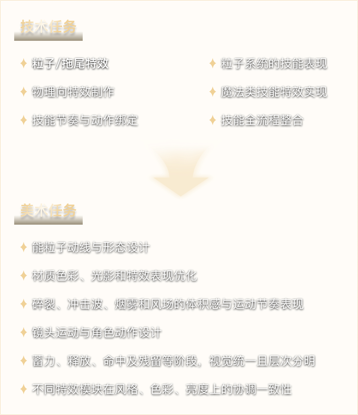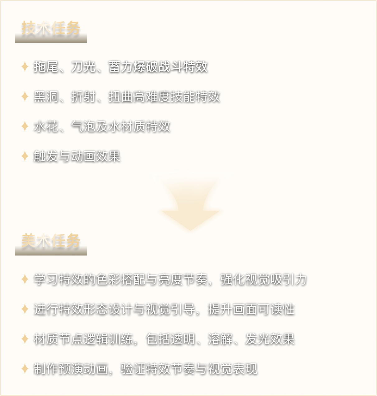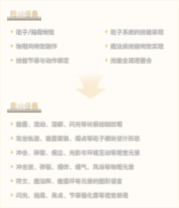 通过本阶段的学习,学员将系统掌握技能特效的核心制作流程,理解技能从 蓄力 → 引导 → 释放 → 残留 的视觉节奏与逻辑表现。