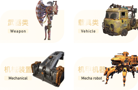 本阶段开放多种题材硬表面训练方向,包括武器 / 载具 / 机械装置 / 机甲机器等。